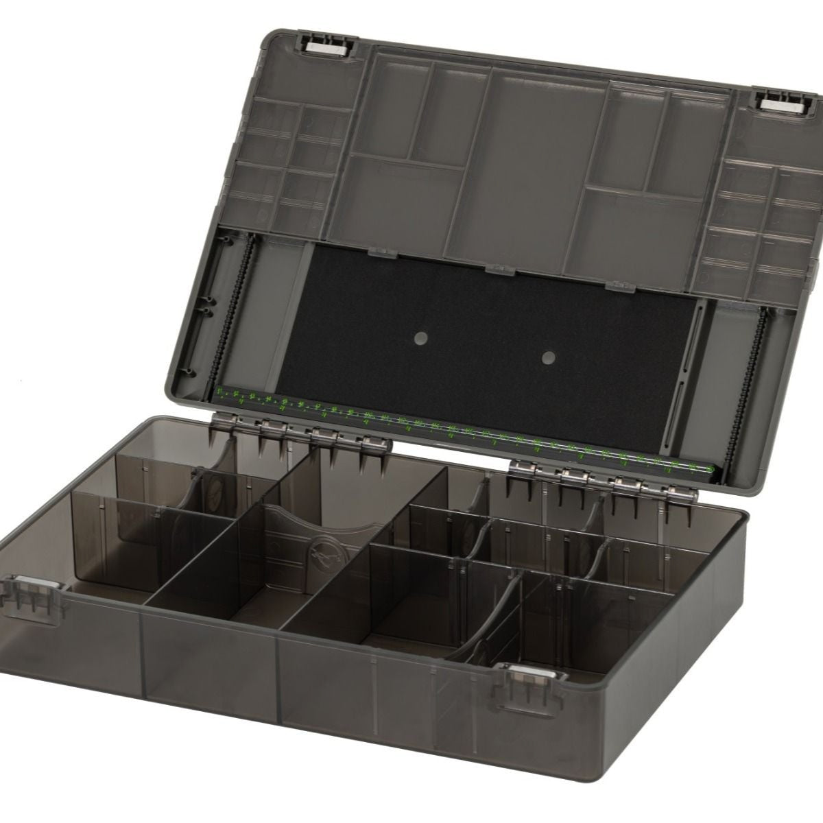 The lid also incorporates a proper rig board, just like you would find in a Rig Safe, complete with a machined, grooved hook retention bar. The Rig Board can store up to 56 pre-tied rigs and comes supplied with 30 single and 20 double pins to secure them tightly in place. The ingenuity of this tackle box doesn’t stop there, the rig board contains an innovative rig bar which will store your Spinner Booms without the need to have a hook attached. This is something that Damian Clarke devised for use within his own Rig Safe but now a similar idea has been developed for the Large Tackle Box. To finish the Rig Board off there is a hi-vis ruler to help you construct that perfect length rig or boom.